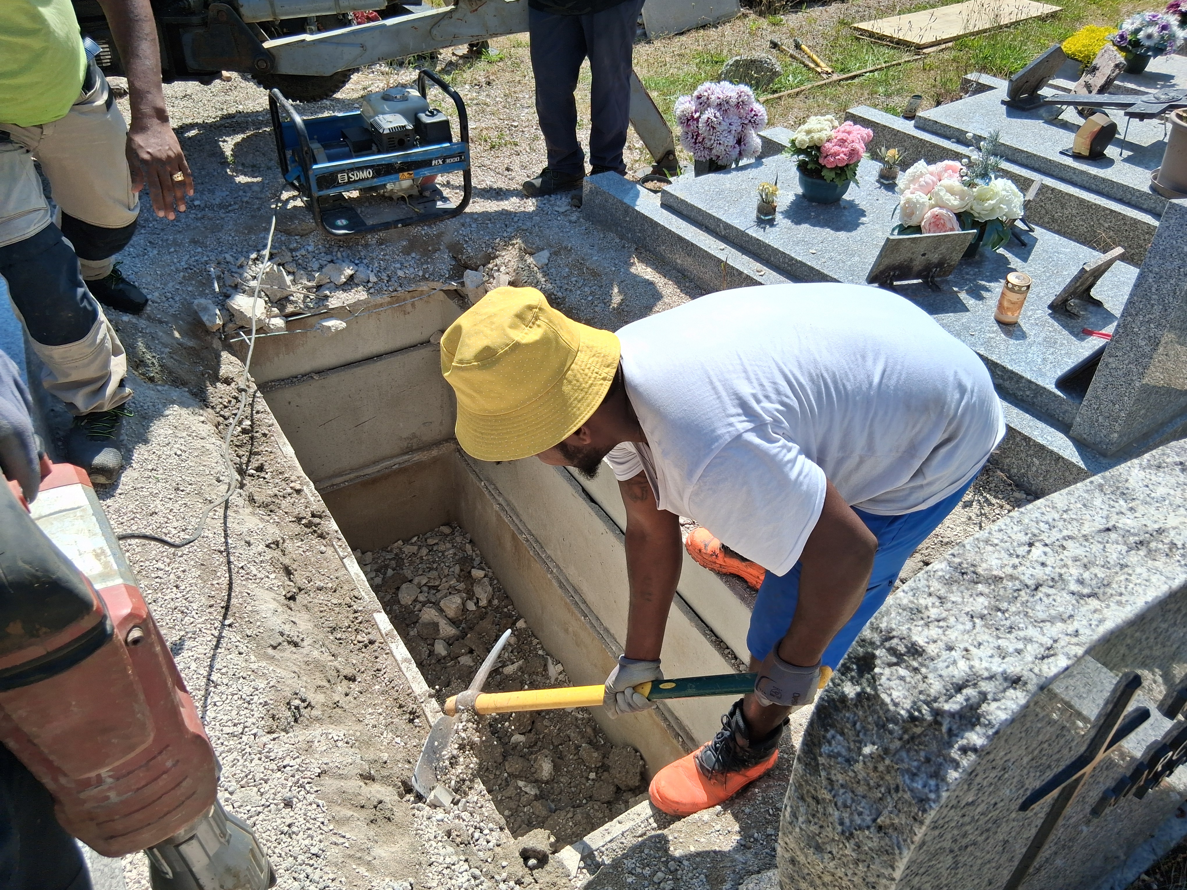 Nous avons également une équipe dédiée aux travaux funéraires , création de caveaux , relèvement de tombes ect ....